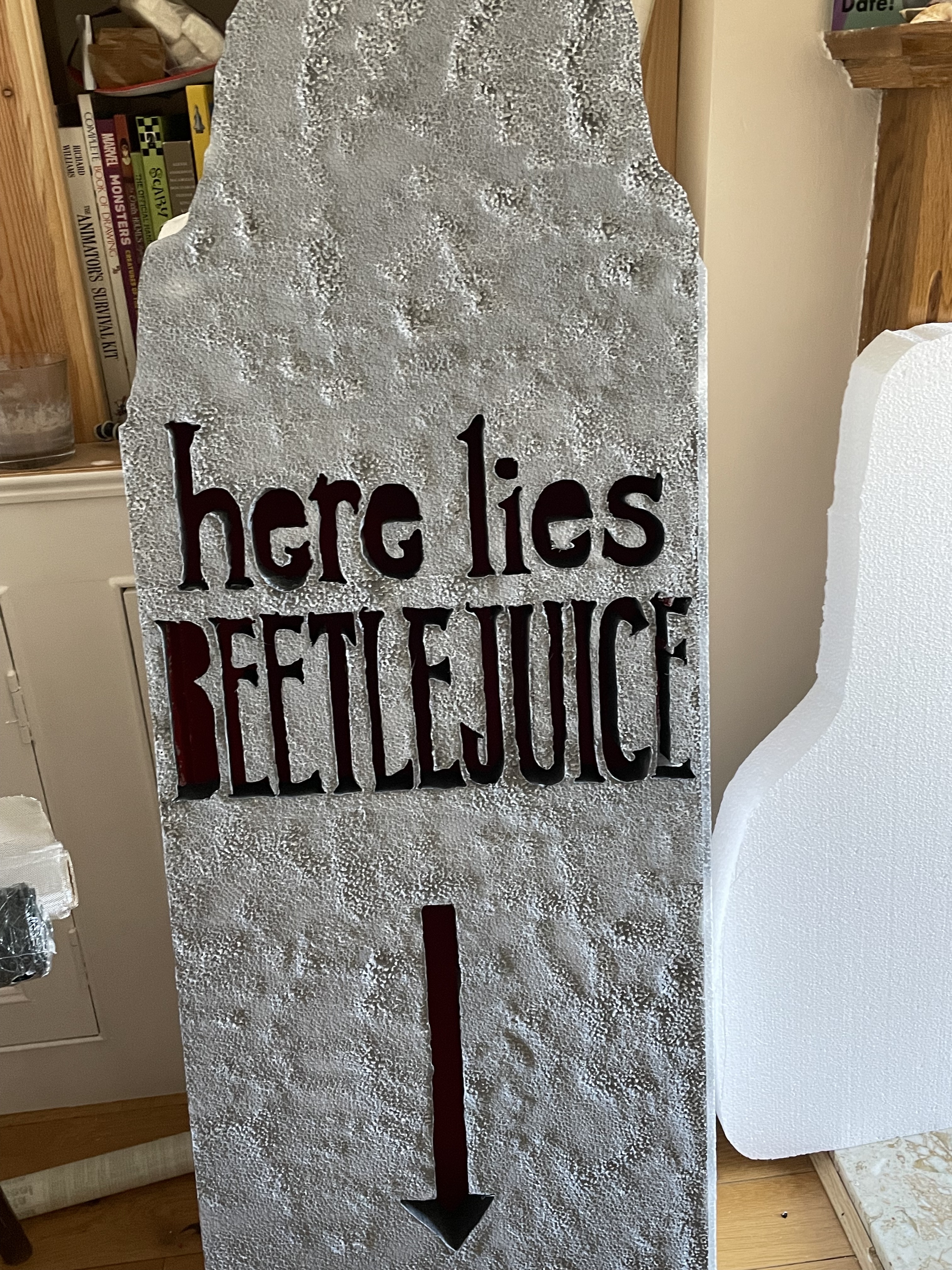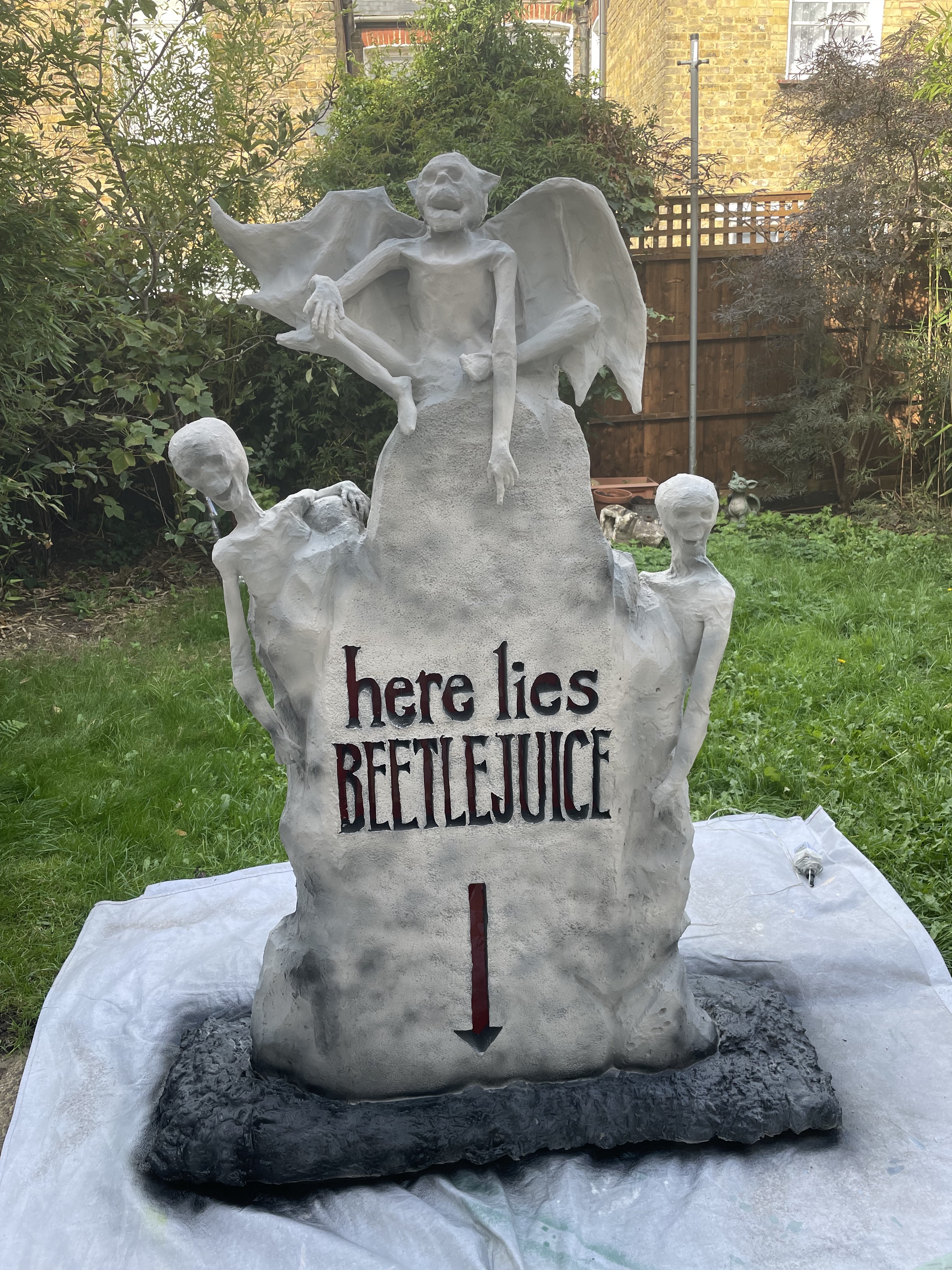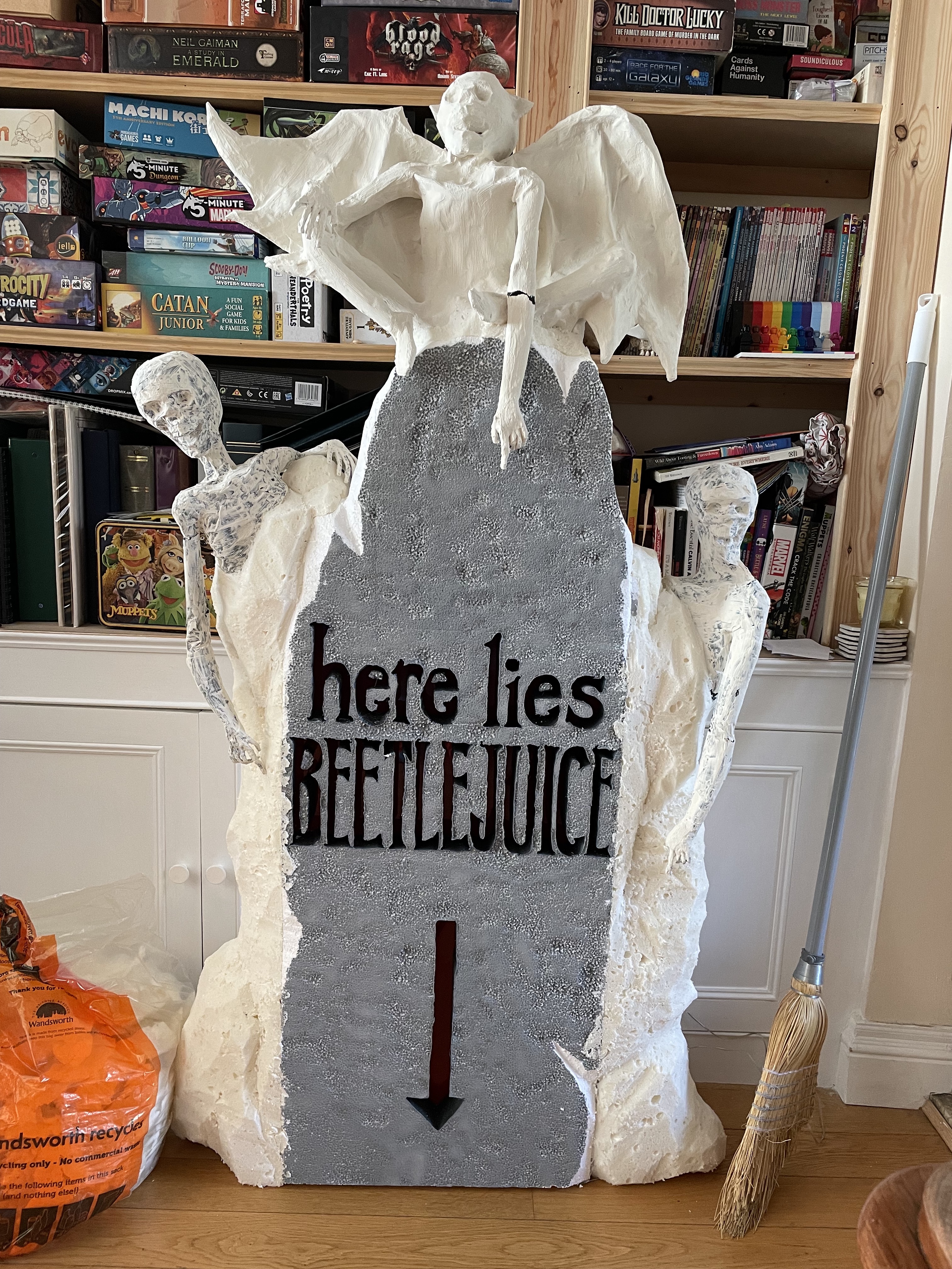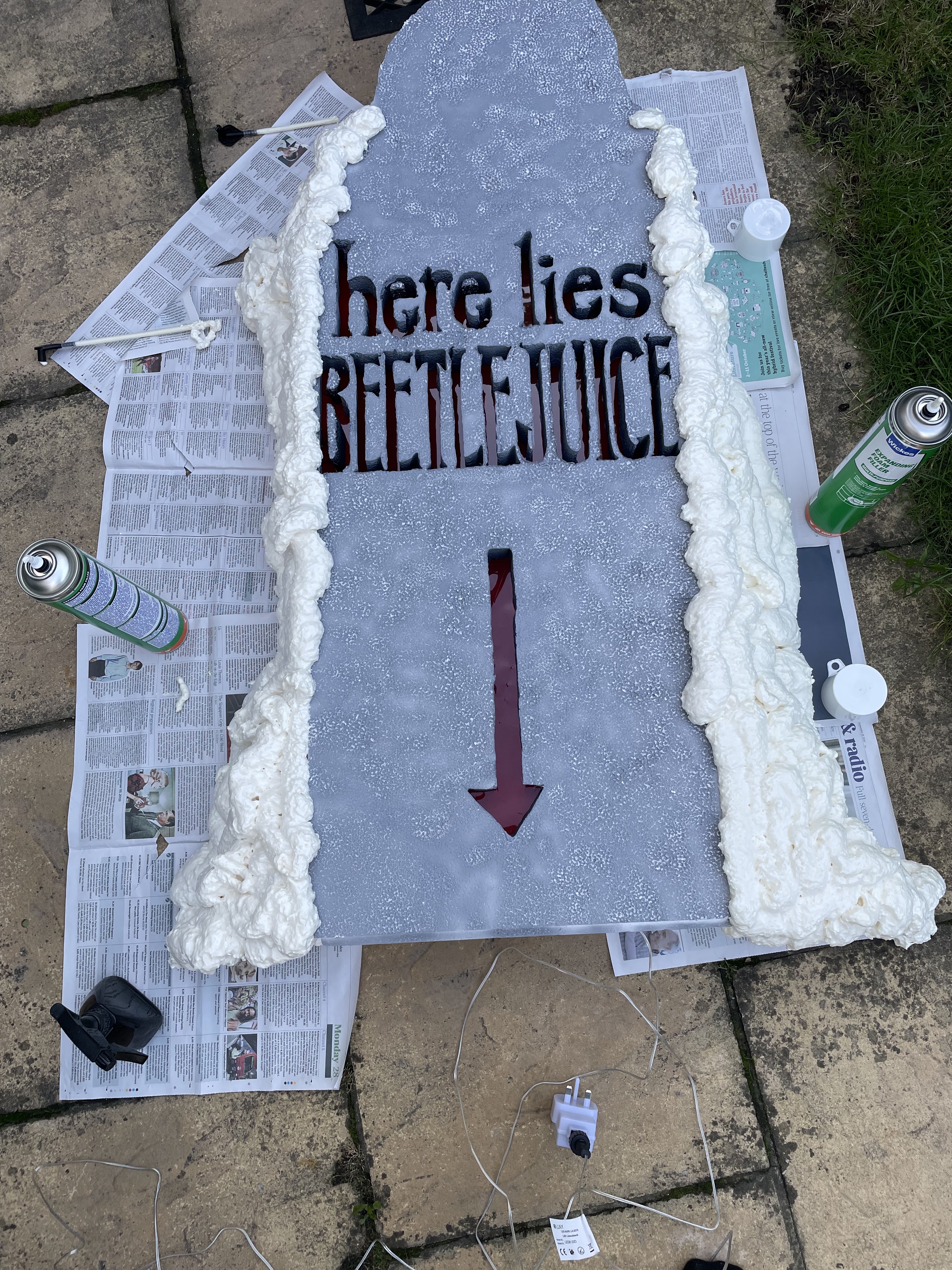This light-up foam tombstone is made of three sheets of styrofoam with LED lights inside. The demons are made of small skeletons wrapped in foam and tape, and the whole thing is covered in plaster and masonry paint to make it look and feel like stone.