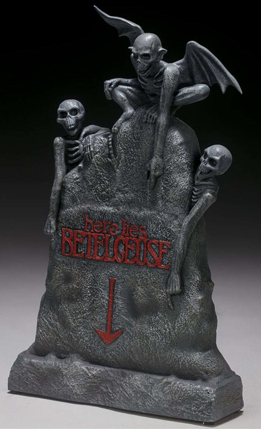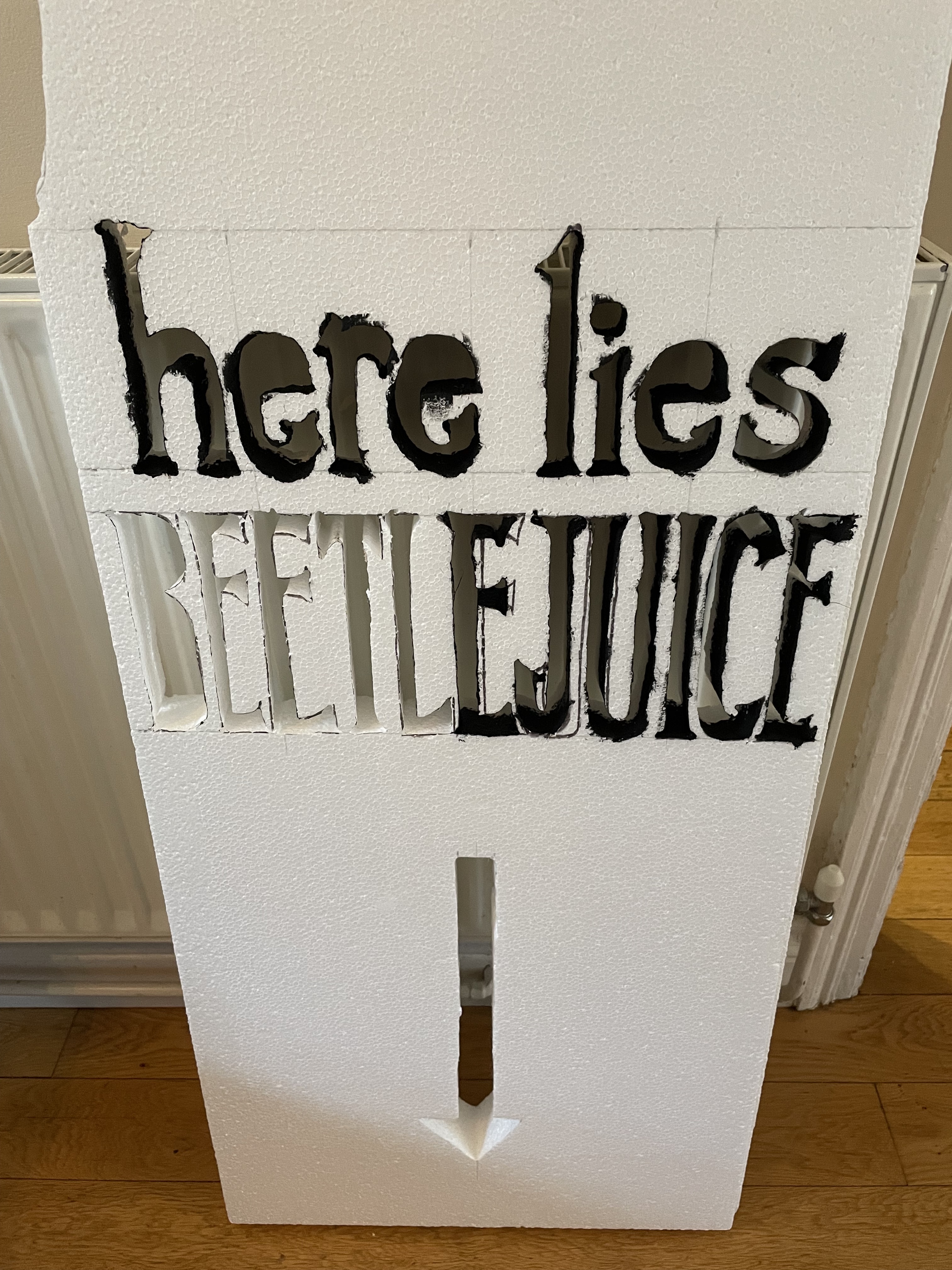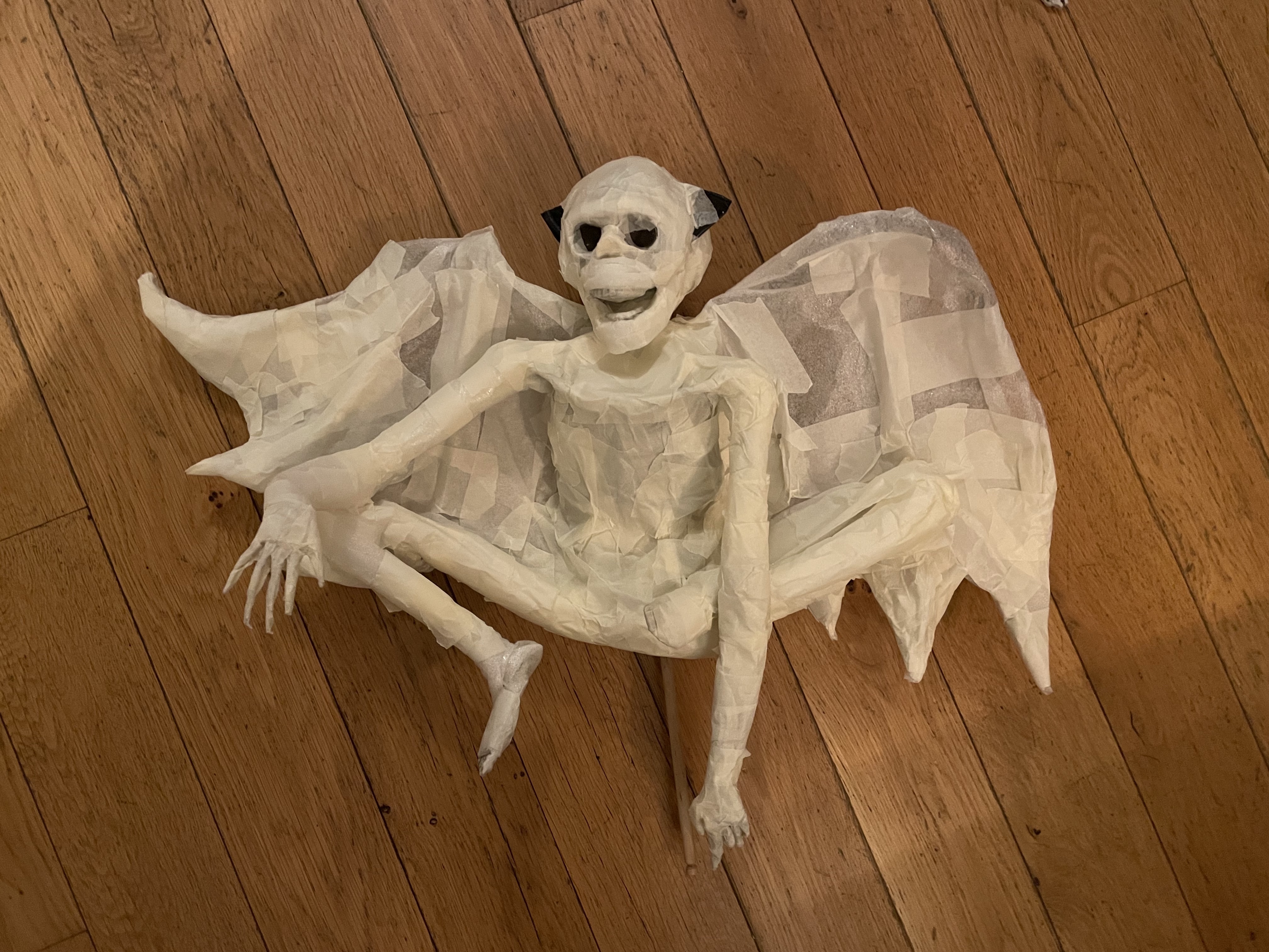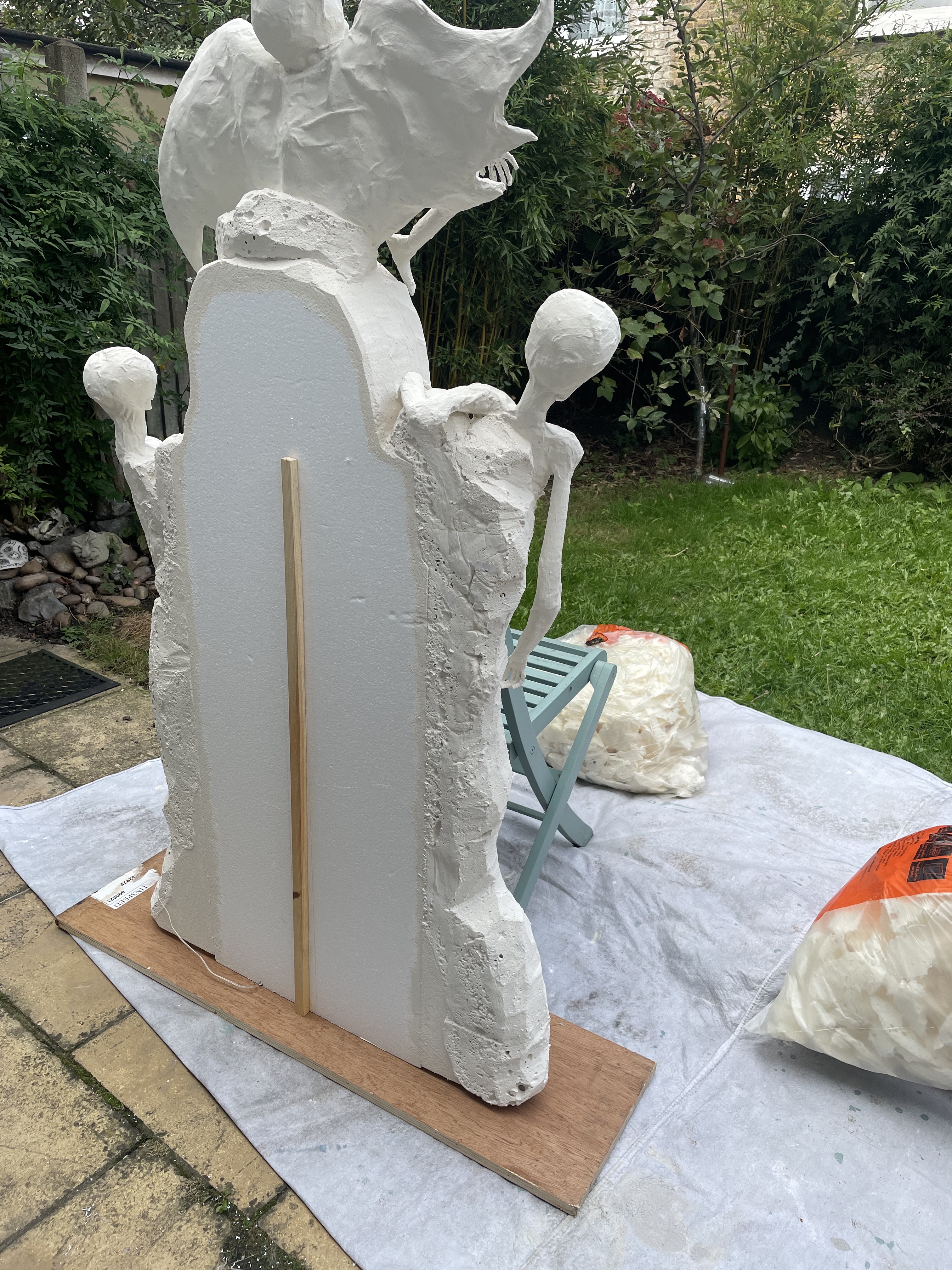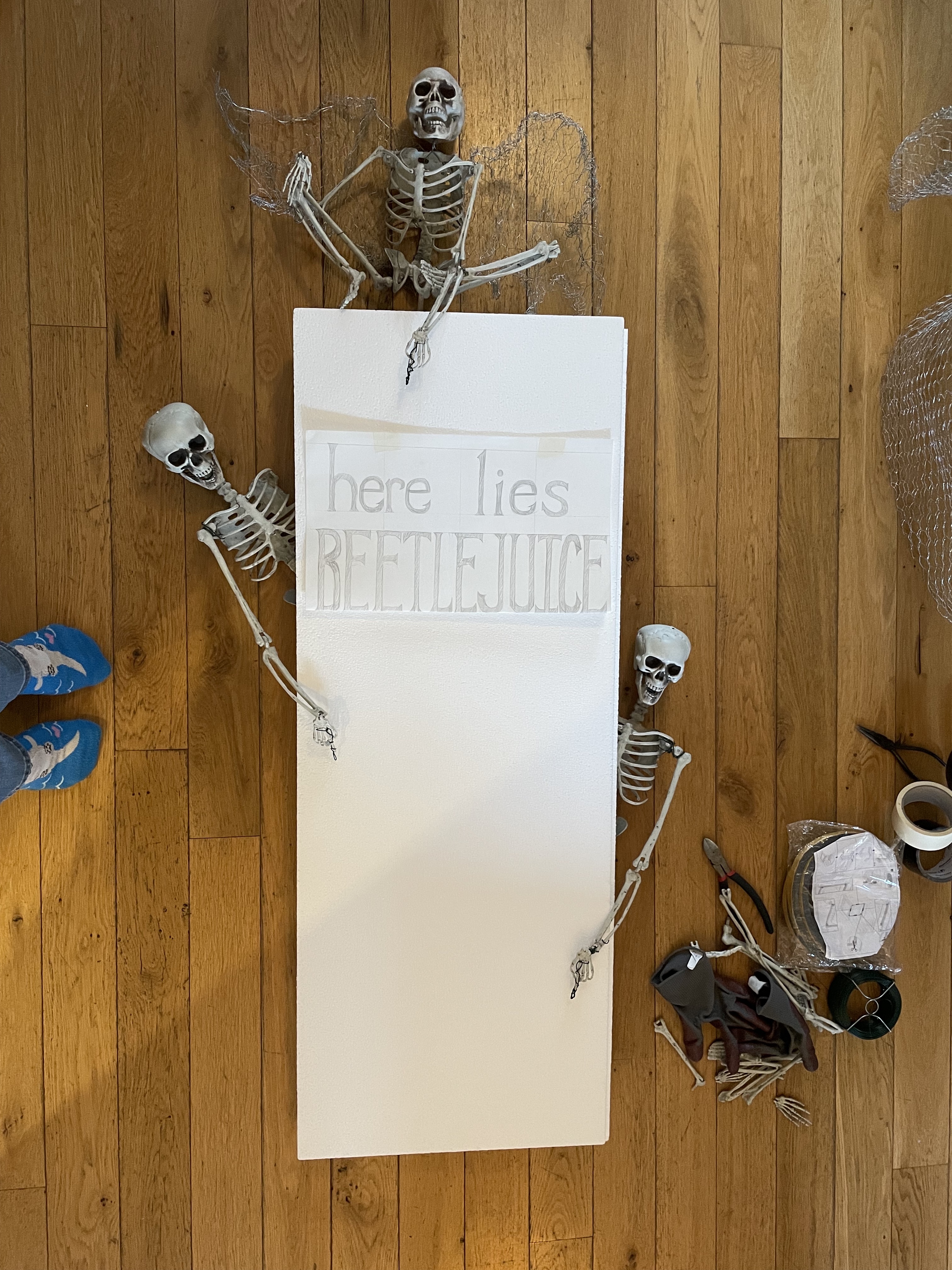 This light-up foam tombstone is made of three sheets of styrofoam with LED lights inside. The demons are made of small skeletons wrapped in foam and tape, and the whole thing is covered in plaster and masonry paint to make it look and feel like stone.